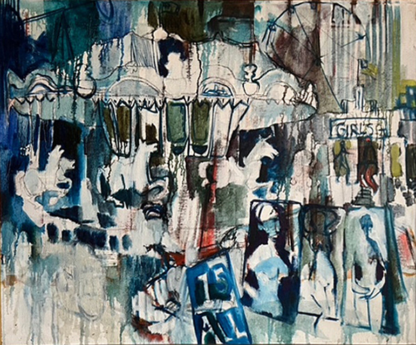 (below left to right) Tumbling Nude, pencil, 1964; Art for Heart Fund, acrylic, 1966; Dance Movement, graphite, 1961, from the collection of Marilyn Berens, Great Northwestern, acrylic, 1969, from the collection of Bill and Louise Booth