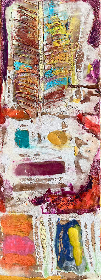 (upper right) Mosaic, encaustic, wax transfer and gold leaf on wood panel, 2022